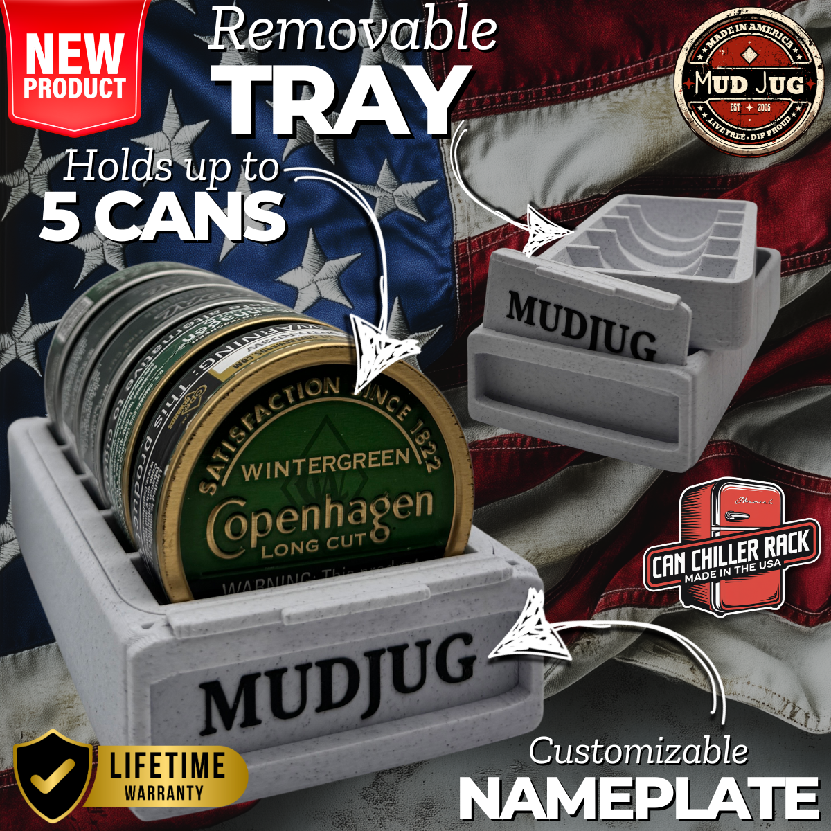 Tired of dip cans rolling around everywhere? The Can Chiller Rack is the ultimate storage solution that keeps your cans organized and eliminates the mess of scattered tins. Designed for durability and convenience, this Made in the USA rack features a removable tray for easy access and cleaning, along with a customizable nameplate to make it your own. Whether in your fridge, truck, or man cave, this rack ensures your cans stay neatly stacked and always within reach.